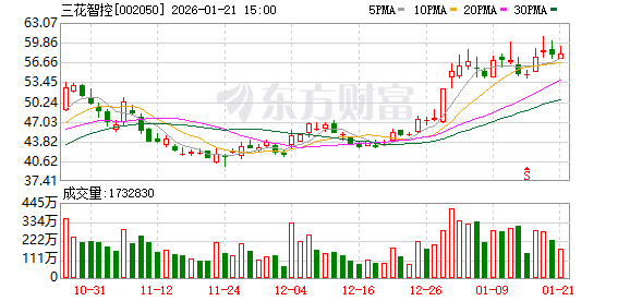 公司股价与资金流向 - 2025年1月22日盘中,公司股价下跌2.02%,报56.78元/股,总市值2389.31亿元,当日成交额41.10亿元,换手率1.93% [1] - 当日主力资金净流出6.24亿元,特大单买卖净流出4.34亿元,大单买卖净流出1.90亿元 [1] - 公司股价年初至今上涨2.88%,近5日上涨4.01%,近20日上涨26.85%,近60日上涨8.17% [1] 公司业务与行业 - 公司主营业务分为制冷空调电器零部件和汽车零部件两大分部,2025年1-9月营收构成分别为63.88%和36.12% [2] - 制冷空调电器零部件业务主要产品包括四通换向阀、电子膨胀阀、电磁阀、微通道换热器、Omega泵等 [2] - 汽车零部件业务专注于汽车热管理,主要产品包括热力膨胀阀、电子膨胀阀、电子水泵、新能源车热管理集成组件等 [2] - 公司所属申万行业为家用电器-家电零部件Ⅱ-家电零部件Ⅲ,概念板块包括机器人执行器、汽车热管理、汽车零部件、人形机器人等 [2] 公司财务与股东 - 2025年1-9月,公司实现营业收入240.29亿元,同比增长16.86%,归母净利润32.42亿元,同比增长40.85% [3] - 截至2025年9月30日,公司股东户数为44.55万户,较上期增加72.68%,人均流通股8271股,较上期减少41.88% [3] - A股上市后累计派现88.25亿元,近三年累计派现36.39亿元 [4] - 截至2025年9月30日,十大流通股东中,香港中央结算有限公司持股1.66亿股,较上期减少1041.39万股,多只沪深300ETF及广发国证新能源车电池ETF位列其中 [4] 公司基本信息 - 公司全称为浙江三花智能控制股份有限公司,成立于1994年9月10日,于2005年6月7日上市 [2] - 公司注册地址位于浙江省绍兴市新昌县,并在香港设有办公地址 [2]
