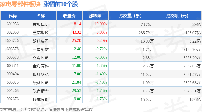 板块整体表现 - 2023年10月17日,家电零部件板块整体下跌0.77%,表现弱于上证指数(下跌1.95%)和深证成指(下跌3.04%)[1] - 板块内个股表现分化,东贝集团以10.00%的涨幅领涨,海达尔以5.18%的跌幅领跌[1][2] 领涨个股表现 - 东贝集团收盘价为8.14元,涨幅为10.00%,成交量78.76万手,成交额达到6.29亿元[1] - 三花智控收盘价为43.32元,微涨0.93%,但成交活跃,成交量236.79万手,成交额高达103.07亿元[1] 领跌个股表现 - 海达尔领跌板块,收盘价为54.19元,跌幅达5.18%,成交量为4444.88手,成交额为2466.13万元[2] - 宏昌科技和海立股份跌幅并列第二,均为4.74%,海立股份成交额较高,达8.18亿元[2] 板块资金流向 - 当日家电零部件板块整体呈现主力资金和游资净流入,主力资金净流入2447.99万元,游资资金净流入1.12亿元,散户资金净流出1.36亿元[2] - 三花智控获得主力资金净流入1.76亿元,主力净占比1.71%,同时游资净流入1.58亿元[3] - 东贝集团主力资金净流入1.49亿元,主力净占比高达23.68%,但游资和散户资金分别净流出8183.81万元和6712.21万元[3]