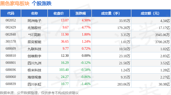 市场整体表现 - 2024年1月15日,黑色家电板块整体下跌1.85%,表现弱于大盘,当日上证指数下跌0.33%,深证成指上涨0.41% [1] - 板块内个股表现分化显著,四川长虹和*ST高斯均以5.00%的涨幅领涨,而兆驰股份以9.75%的跌幅领跌 [1] 个股价格与交易表现 - 四川长虹收盘价为10.70元,上涨5.00%,成交量为595.54万手,成交额为64.35亿元 [1] - *ST高斯收盘价为11.96元,上涨5.00%,成交额为1.50亿元 [1] - 兆驰股份收盘价为8.70元,下跌9.75%,成交额为24.18亿元,是板块中成交额最高的个股 [1] - 海信视像收盘价为23.50元,下跌1.22%,成交额为2.96亿元 [1] - 创维数字收盘价为12.55元,下跌1.57%,成交额为2.15亿元 [1] - 四川九洲收盘价为17.02元,下跌2.74%,成交额为6.48亿元 [1] - 九联科技收盘价为9.90元,下跌3.98%,成交额为2.18亿元 [1] 板块资金流向 - 当日黑色家电板块整体呈现主力资金净流入,净流入金额为3.1亿元,而游资和散户资金均为净流出,金额分别为1.81亿元和1.29亿元 [1] - 四川长虹获得主力资金净流入5.90亿元,主力净占比达9.17%,是板块中主力资金流入最显著的个股 [2] - 兆驰股份遭遇主力资金大幅净流出1.89亿元,主力净占比为-7.84%,是板块中主力资金流出最多的个股 [2] - 九联科技虽然股价下跌,但获得游资净流入2574.27万元,游资净占比高达11.81% [2] - 海信视像获得主力资金净流入236.61万元,同时游资也净流入276.23万元 [2] - 四川九洲、创维数字、同洲电子均呈现主力资金净流出,金额分别为4276.51万元、2252.01万元和1999.27万元 [2]