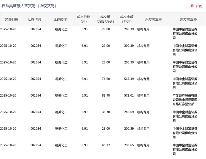大宗交易概况 - 2025年10月20日,德美化工发生大宗交易,总成交量为352.3万股,总成交金额为2434.4万元,占当日该股总成交额的5.21% [1] - 此次大宗交易的成交价格为每股6.91元,较当日市场收盘价7.96元折价13.19% [1] 交易明细分析 - 当日大宗交易共分8笔完成,所有交易的成交价格均为每股6.91元 [2] - 单笔成交量在29万股至82.78万股之间,单笔成交金额在200.39万元至572.01万元之间 [2] - 总成交量352.3万股由8笔交易构成,具体包括29万股、29万股、29万股、74.6万股、82.78万股、35.7万股、29万股和43.22万股 [2] 交易参与方 - 所有8笔大宗交易的买方营业部均显示为“机构专用” [2] - 卖方营业部主要集中在中国中金财富证券有限公司佛山分公司,共涉及7笔交易,另有1笔交易的卖方为广发证券股份有限公司佛山顺德南国东路证券营业部 [2]