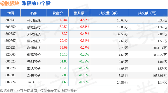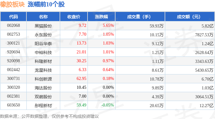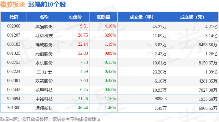 | 代码 | 名称 | 收盘价 | 涨跌幅 | 成交量(手) | 成交额(元) | | --- | --- | --- | --- | --- | --- | | 002068 | 黑猫股份 | 9.72 | 5.65% | 59.93万 | 5.82亿 | | 002753 | 永东股份 | 7.70 | 1.05% | 10.15万 | 7827.53万 | | 300121 | 阳谷华泰 | 13.73 | 1.03% | 9.12万 | 1.24亿 | | 920694 | 中裕科技 | 21.01 | 1.01% | 1.25万 | 2628.64万 | | 920098 | 科隆新材 | 30.25 | 0.97% | 1.11万 | 3343.63万 | | 002442 | 龙星科技 | 6.33 | 0.64% | 8.61万 | 5430.65万 | | 300731 | 科创新源 | 62.95 | 0.18% | 10.78万 | 6.70亿 | | 300320 | 海达股份 | 10.45 | 0.00% | 9.89万 | 1.03亿 | | 002381 | 双箭股份 | 7. ...