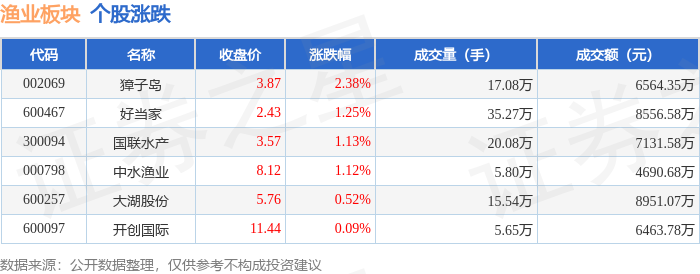 | 代码 | 名称 | 主力净流入(元) | 主力净占比 游资净流入 (元) | | 游资净占比 散户净流入 (元) | | 散户净占比 | | --- | --- | --- | --- | --- | --- | --- | --- | | 600097 开创国际 | | > 300.73万 | 5.86% | 575.59万 | 11.21% | -876.33万 | -17.07% | | 000798 中水渔业 | | 297.31万 | 8.61% | 142.79万 | 4.14% | -440.09万 | -12.75% | | 300094 国联水产 | | 206.48万 | 3.73% | -375.21万 | -6.79% | 168.73万 | 3.05% | | 600467 | 好当家 | 172.16万 | 2.35% | -400.95万 | -5.48% | 228.79万 | 3.13% | | 002069 障子岛 | | -327.81万 | -6.35% | 46.87万 | 0.91% | 280.95万 | 5.44% | | 600257 大湖股份 | | - ...