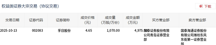 10月13日,孚日股份大宗交易成交1070万股,成交额4975.5万元,占当日总成交额的17.27%,成交价 4.65元,较市场收盘价5元折价7%。 | 交易日期 | 证券代码 | 证券简称 | 成交价格 (元) | 成交量 (万股/万份) | 成交金额 买方营业部 (万元) | 卖方营业部 | | --- | --- | --- | --- | --- | --- | --- | | 2025-10-13 | 002083 | 孚日股份 | 4.65 | 1,070.00 | 4,975.国泰证券股份有限 | 国泰海通证券股份 | | | | | | | 公司青岛证券营业 | 有限公司潍坊东风 | | | | | | | 部 | 东街第一证券营业 | | | | | | | | 高 | ...