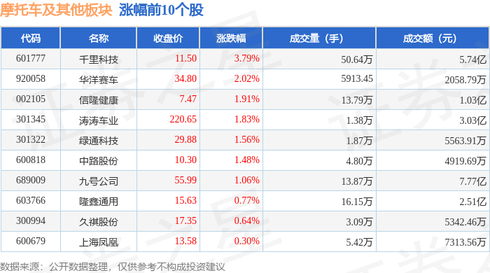 市场整体表现 - 2024年1月9日,摩托车及其他板块整体上涨0.45%,表现弱于当日上证指数0.92%和深证成指1.15%的涨幅 [1] - 板块内个股表现分化,在列出的20只个股中,10只上涨,7只下跌,另有3只涨跌幅近乎持平 [1][2] 领涨个股表现 - 涛涛车业领涨板块,收盘价250.78元,单日涨幅达4.88%,成交额5.65亿元,成交量2.29万手 [1] - 千里科技涨幅1.93%,收盘价12.13元,成交额7.94亿元,成交量66.01万手,为当日板块成交量最高的个股 [1] - 信隆健康、九号公司、钱江摩托等个股涨幅在0.45%至0.96%之间 [1] 下跌个股表现 - 征和工业领跌板块,跌幅1.82%,收盘价72.67元 [2] - 永安行跌幅1.13%,收盘价19.17元 [2] - 隆鑫通用、春风动力等个股跌幅在0.30%至0.85%之间 [2] 板块资金流向 - 当日摩托车及其他板块整体呈现主力资金和游资净流出,散户资金净流入的格局 [2] - 板块主力资金净流出1.94亿元,游资资金净流出3889.48万元,散户资金净流入2.33亿元 [2] - 春风动力是少数获得主力资金净流入的个股,净流入933.43万元,主力净占比2.02%,但游资净流出5390.10万元 [3] - 林海股份主力资金净流入145.74万元,主力净占比4.06% [3] - 多数个股主力资金为净流出状态,其中绿通科技主力净流出387.21万元,主力净占比-9.41%,信隆健康主力净流出334.27万元,主力净占比-3.74% [3]