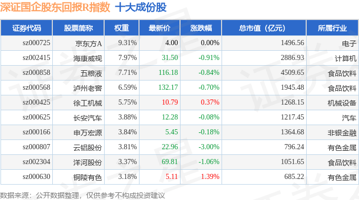 资金流向方面,深证国企股东回报R(470064)指数成份股当日主力资金净流出合计11.25亿元,游资资 金净流入合计2.43亿元,散户资金净流入合计8.82亿元。成份股资金流向详情见下表: | 代码 | 名称 | 主力净流入(元) | 主力净占比 游资净流入 (元) | | 游资净占比 散户净流入 (元) | | 散户净占比 | | --- | --- | --- | --- | --- | --- | --- | --- | | 000630 铜陵有色 | | 8802.48万 | 7.20% | -5392.42万 | -4.41% | -3410.05万 | -2.79% | | 000568 泸州老窖 | | 5779.00万 | 7.05% | -2256.65万 | -2.75% | -3522.36万 | -4.30% | | 000786 北新建材 | | 5657.76万 | 9.17% | -2459.25万 | -3.99% | -3198.51万 | -5.18% | | 000060 中金岭南 | | 4410.83万 | 9.97% | -760.96万 | -1.72% | -3 ...