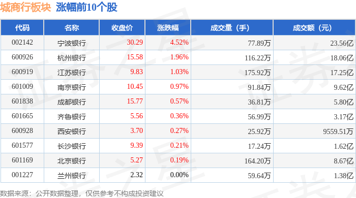 城商行板块市场表现 - 2024年1月26日,城商行板块整体上涨1.14%,表现显著强于大盘,当日上证指数下跌0.09%,深证成指下跌0.85% [1] - 板块内个股涨多跌少,在列出的19只股票中,10只上涨,6只下跌,3只收平 [1][2] - 宁波银行以4.52%的涨幅领涨板块,收盘价为30.29元,成交额达23.56亿元 [1] 领涨个股详情 - 宁波银行涨幅最大为4.52%,成交量为77.89万手,成交额为23.56亿元 [1] - 杭州银行上涨1.96%,收盘价15.58元,成交量116.22万手,成交额18.06亿元 [1] - 江苏银行上涨1.03%,收盘价9.83元,成交量175.92万手,成交额17.25亿元 [1] - 南京银行上涨0.97%,收盘价10.45元,成交量91.84万手,成交额9.62亿元 [1] 下跌及持平个股详情 - 重庆银行跌幅最大为-1.15%,收盘价10.32元,成交量11.09万手,成交额1.14亿元 [2] - 上海银行下跌0.96%,收盘价9.26元,成交量73.44万手,成交额6.85亿元 [2] - 兰州银行、郑州银行收盘价与上一交易日持平,涨跌幅为0.00% [1][2] 板块资金流向 - 当日城商行板块整体获得主力资金净流入9.16亿元,但游资资金净流出3.29亿元,散户资金净流出5.87亿元 [2] - 江苏银行获得主力资金净流入最多,达2.66亿元,主力净占比为15.45% [3] - 杭州银行主力资金净流入1.54亿元,主力净占比8.55% [3] - 南京银行主力资金净流入1.51亿元,主力净占比15.68% [3] - 上海银行在股价下跌0.96%的情况下,仍获得主力资金净流入1.04亿元,主力净占比15.17% [3] - 宁波银行虽然股价领涨,但主力资金净流入仅为3053.13万元,主力净占比1.30%,同时游资净流出2.00亿元 [3]