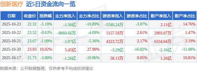 创新医疗(002173)10月23日主力资金净卖出1.56亿元