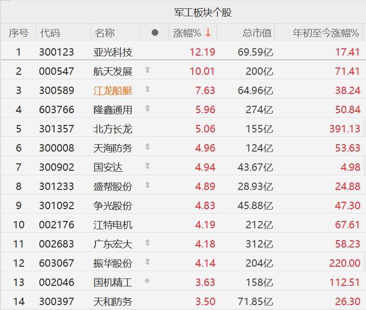 军工板块市场表现 - A股市场军工股表现活跃,多只个股出现显著上涨,其中亚光科技涨幅超过12%,航天发展涨停(10%),江龙船艇涨幅超过7% [1] - 涨幅超过5%的个股包括隆鑫通用和北方长龙,涨幅超过4%的个股包括天海防务、国安达、盛帮股份、争光股份、江特电机、广东宏大、振华股份 [1] - 国机精工和天和防务涨幅超过3% [1] 个股具体数据 - 亚光科技涨幅12.19%,总市值69.59亿元,年初至今涨幅17.41% [2] - 航天发展涨幅10.01%,总市值200亿元,年初至今涨幅71.41% [2] - 江龙船艇涨幅7.63%,总市值64.96亿元,年初至今涨幅38.24% [2] - 北方长龙年初至今涨幅达391.13%,总市值155亿元,振华股份年初至今涨幅220.00%,总市值204亿元 [2] - 国机精工年初至今涨幅112.51%,总市值158亿元,天和防务总市值71.85亿元,年初至今涨幅26.30% [2]