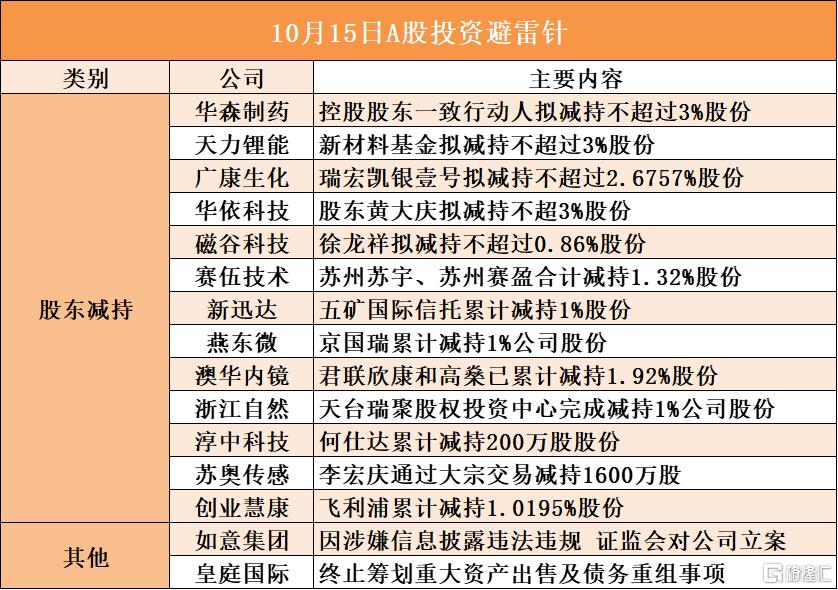 | | | 10月15日A股投资避雷针 | | --- | --- | --- | | 类别 | 公司 | 主要内容 | | | 华森制药 | 控股股东一致行动人拟减持不超过3%股份 | | | 天力锂能 | 新材料基金拟减持不超过3%股份 | | | 厂康生化 | 瑞宏凯银壹号拟减持不超过2.6757%股份 | | | 华依科技 | 股东黄大庆拟减持不超3%股份 | | | 磁谷科技 | 徐龙祥拟减持不超过0.86%股份 | | | 赛伍技术 | 苏州苏宇、苏州赛盈合计减持1.32%股份 | | 股东减持 | 新迅达 | 五矿国际信托累计减持1%股份 | | | 燕东微 | 京国瑞累计减持1%公司股份 | | | 澳华内镜 | 君联欣康和高燊已累计减持1.92%股份 | | | 浙江自然 | 天台瑞聚股权投资中心完成减持1%公司股份 | | | 淳中科技 | 何仕达累计减持200万股股份 | | | 赤奥传感 | 李宏庆通过大宗交易减持1600万股 | | | 创业慧康 | 飞利浦累计减持1.0195%股份 | | 其他 | 如意集团 | 因涉嫌信息披露违法违规 证监会对公司立案 | | | 皇庭国际 | ...
