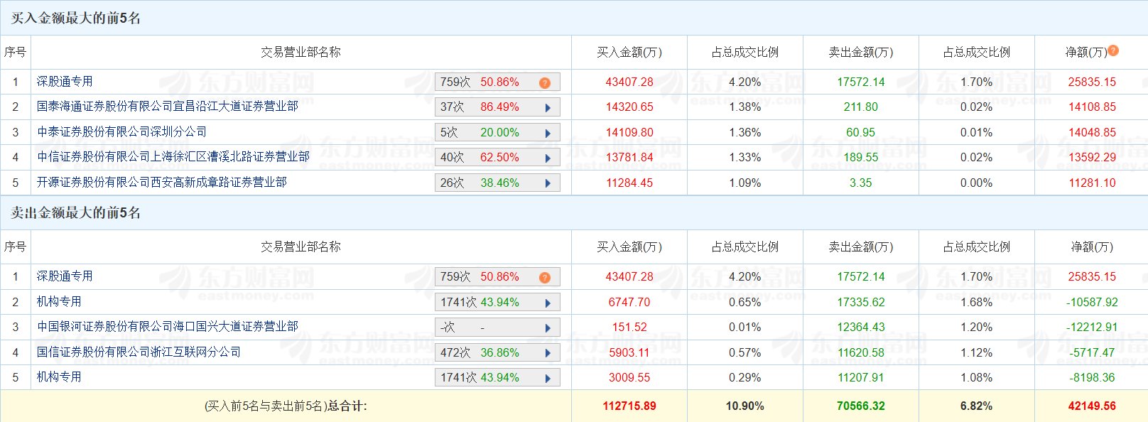 岩山科技(002195.SZ)今日涨停,录得6天5板,换手率16.63%,成交额103.42亿元。龙虎榜数据显示,深股通买入4.34亿元,卖出1.76亿元,净买入2.58亿 元;两家机构买入9757万元,卖出2.85亿元,净卖出1.88亿元;游资"消闲派"位列买二席位,净买入1.41亿元;"量化打板"位列买四席位,净买入1.36亿元。 上榜席位全天买入11.27亿元,卖出7.06亿元,合计净买入4.21亿元。(格隆汇) | 序号 | 交易营业部名称 | | | 买人金额(万) | 占总成交比例 | | --- | --- | --- | --- | --- | --- | | 1 | 深股通专用 | 759次 50.86% | 2 | 43407.28 | 4.20% | | 2 | 国泰海通证券股份有限公司宜昌沿江大道证券营业部 | 37 次 86.49% | A | 14320.65 | 1.38% | | 3 | 中泰证券股份有限公司深圳分公司 | 5次 20.00% | ▶ | 14109.80 | 1.36% | | 4 | 中信证券股份有限公司上海徐汇区漕溪北路证券营业部 | 40次 62.50% ...