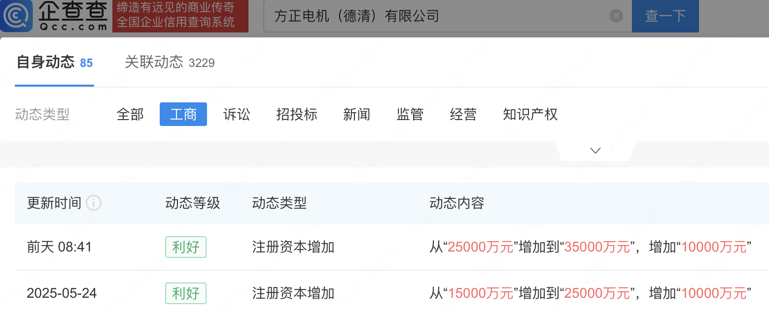 | 缔造有远见的商业传奇 | 全国企业信用查询系统 | | | | 方正电机(德清)有限公司 | | | | --- | --- | --- | --- | --- | --- | --- | --- | | 自身动态 85 | 关联动态 3229 | | | | | | | | 动态类型 | 全部 工程 | 诉讼 | | 招投标 | 新闻 | 监管 | 经营 知识产 | | 更新时间(i) | | 动态等级 | 动态类型 | | | | 动态内容 | | 利好 | 前天 08:41 | | 注册资本增加 | | | | 从"25000万元"增加 | | 2025-05-24 | 利好 | | 注册资本增加 | | | | 从"15000万元"增加 | | !合合 R可 | 全国企业信用查询 | | 方正电机(德清)有限公司 | | | | ×) 查一下 | | 基本信息 38 | | 法律诉讼 6 | | | 经营风险 21 | | 经营信息 205 | | 法定代表人 | | 牛铭奎 【容 关联企业 8 | | | 登记状态 | | 存续 | | | | | | | 注册资本 | | 35000万元 山 ...