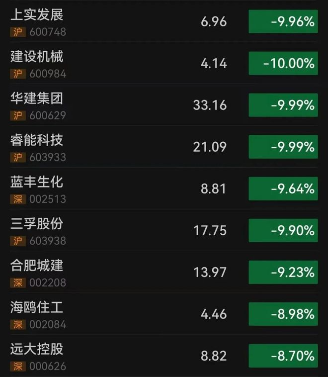 | 上实发展 | 6.96 | -9.96% | | --- | --- | --- | | 沪 600748 | | | | 建设机械 | 4.14 | -10.00% | | 沪 600984 | | | | 天津集团 | 33.16 | -9.99% | | 沪 600629 | | | | 睿能科技 | 21.09 | -9.99% | | 沪 603933 | | | | 蓝丰生化 | 8.81 | -9.64% | | 深 002513 | | | | 三浮股份 | 17.75 | -9.90% | | 沪 603938 | | | | 合肥城建 | 13.97 | -9.23% | | 深 002208 | | | | 海鸥住工 | 4.46 | -8.98% | | 深 002084 | | | | 远大控股 | 8.82 | -8.70% | | 深 000626 | | | 编辑|钉钉 10月23日午后,高位人气股持续调整,上实发展、建设机械双双 跌停,此前, 华建集团、睿能科技 已跌停;蓝丰生化、 三孚股份、 合肥城建 跌超9%, 海鸥住工、远大控股等跟跌。 ...