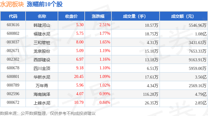 证券之星消息,10月20日水泥板块较上一交易日上涨0.24%,韩建河山领涨。当日上证指数报收于 3863.89,上涨0.63%。深证成指报收于12813.21,上涨0.98%。水泥板块个股涨跌见下表: | 代码 | 名称 | 主力净流入(元) | 主力净占比 游资净流入 (元) | | 游资净占比 散户净流入 (元) | | 散户净占比 | | --- | --- | --- | --- | --- | --- | --- | --- | | 600585 | 海螺水泥 | 1834.58万 | 3.12% | -1287.17万 | -2.19% | -547.41万 | -0.93% | | 000401 | 金隅莫东 | 1041.68万 | 18.27% | 286.47万 | 5.03% | -1328.15万 | -23.30% | | 600425 | 青松建化 | 889.99万 | 5.27% | 404.62万 | 2.39% | -1294.61万 | -7.66% | | 600801 | 华新水泥 | 397.24万 | 1.12% | 180.93万 | 0.51% | -578. ...