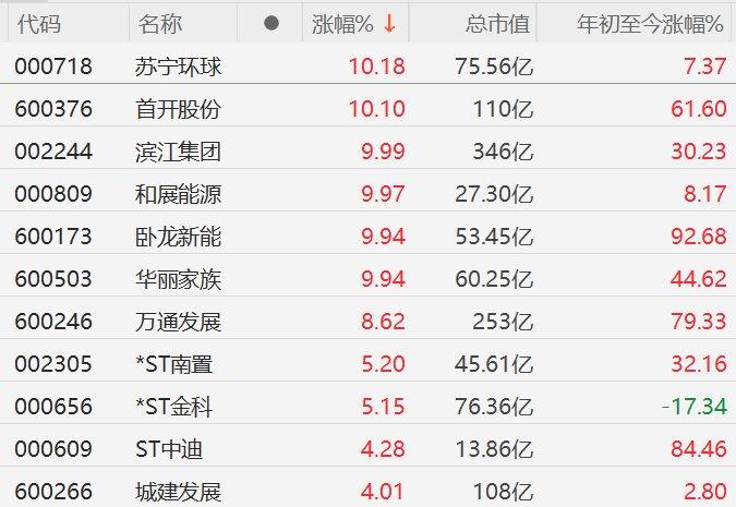 房地产股市场表现 - A股市场房地产股走强,多只个股出现显著上涨,其中苏宁环球、首开股份、滨江集团、和展能源、卧龙新能、华丽家族均以10%左右涨幅涨停,万通发展上涨超过8%,城建发展上涨超过4% [1] - 苏宁环球涨幅达10.18%,总市值75.56亿元,年初至今涨幅7.37% [2] - 首开股份涨幅达10.10%,总市值110亿元,年初至今涨幅61.60% [2] - 滨江集团涨幅达9.99%,总市值346亿元,年初至今涨幅30.23% [2] - 和展能源涨幅达9.97%,总市值27.30亿元,年初至今涨幅8.17% [2] - 卧龙新能涨幅达9.94%,总市值53.45亿元,年初至今涨幅92.68% [2] - 华丽家族涨幅达9.94%,总市值60.25亿元,年初至今涨幅44.62% [2] - 万通发展涨幅达8.62%,总市值253亿元,年初至今涨幅79.33% [2] - 城建发展涨幅达4.01%,总市值108亿元,年初至今涨幅2.80% [2] 其他房地产相关个股表现 - *ST南置涨幅5.20%,总市值45.61亿元,年初至今涨幅32.16% [2] - *ST金科涨幅5.15%,总市值76.36亿元,年初至今跌幅17.34% [2] - ST中调涨幅4.28%,总市值13.86亿元,年初至今涨幅84.46% [2]