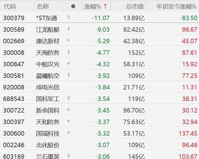 | 代码 | 名称 | | 涨幅% ↑ | 总市值 | 年初至今涨幅% | | --- | --- | --- | --- | --- | --- | | 300379 | *ST东通 | 1 | -11.07 | 13.89亿 | -83.50 | | 300589 | 江龙船艇 | | -9.03 | 92.42亿 | 96.67 | | 002669 | 康达新材 | 章 | -5.29 | 42.38亿 | 45.07 | | 300008 | 天海防务 | 中 | -4.77 | 152亿 | 87.61 | | 300847 | 中船汉光 | - | -4.32 | 58.31亿 | 15.92 | | 300581 | 晨曦航空 | 台 | -3.92 | 109亿 | 77.25 | | 920008 | 成电光信 | | -3.84 | 21.71亿 | 11.31 | | 688543 | 国科军工 | ્ય | -3.54 | 119亿 | 38.31 | | 300722 | 特别科 | 美 | -3.45 | 96.70亿 | 30.12 | | 300397 | 天和防务 | 摩 ...
