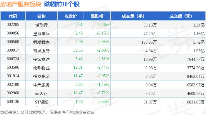 板块整体表现 - 11月10日房地产服务板块整体上涨1.9%,表现优于上证指数(上涨0.53%)和深证成指(上涨0.18%)[1] - 板块内个股普遍上涨,领涨股为皇庭国际,当日涨幅为3.45%[1] - 板块当日主力资金净流入6383.94万元,而游资和散户资金分别净流出2531.13万元和3852.81万元[1] 个股价格表现 - 皇庭国际收盘价2.40元,涨幅3.45%,成交量为47.49万手,成交额为1.13亿元[1] - 宁波富达收盘价5.64元,涨幅2.92%,成交量为15.91万手,成交额为8885.52万元[1] - 特发服务收盘价41.12元,涨幅2.80%,成交量为4.66万手,成交额为1.90亿元[1] - 世联行收盘价2.45元,涨幅2.08%,成交额为9899.11万元[1] - 招商积余收盘价11.81元,涨幅1.81%,成交量为8.12万手,成交额为9547.75万元[1] 个股资金流向 - 珠江股份主力资金净流入2374.26万元,净占比10.66%,是板块中主力资金净流入额最高的个股[2] - 我爱我家主力资金净流入1427.57万元,净占比4.87%[2] - 特发服务主力资金净流入1152.88万元,净占比6.07%[2] - 世联行主力资金净流入1127.88万元,净占比11.39%[2] - 新大正主力资金净流出131.33万元,净占比-3.39%,是表中唯一主力资金呈净流出的个股[2]