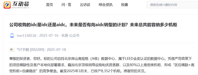 年内ST公司最大现金并购案落地,*ST宇顺回应数据中心业务转型