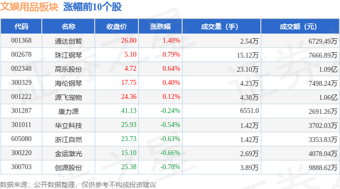 从资金流向上来看,当日文娱用品板块主力资金净流入4268.4万元,游资资金净流入2991.19万元,散户 资金净流出7259.59万元。文娱用品板块个股资金流向见下表: | 代码 | 名称 | 收盘价 | 涨跌幅 | 成交量(手) | 成交额(元) | | | --- | --- | --- | --- | --- | --- | --- | | 002301 | 齐心集团 | 8.17 | 9.96% | 36.01万 | | 2.94亿 | | 6688809 | 晨光股份 | 28.60 | 0.99% | 3.41万 | | 9757.10万 | | 001222 | 源飞宠物 | 24.33 | 0.83% | 4.12万 | | 1.01亿 | | 605299 | 舒华体育 | 10.11 | 0.70% | 9.97万 | | 1.01亿 | | 300651 | 金陵体育 | 23.00 | 0.61% | 13.44万 | | 3.14亿 | | 002103 | 广博股份 | 9.80 | -0.41% | 9.75万 | | 9555.32万 | | 002348 | 高乐股份 | 4 ...