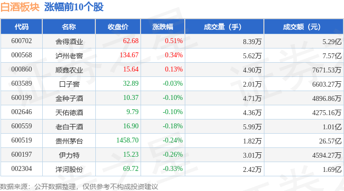 从资金流向上来看,当日白酒板块主力资金净流出1.88亿元,游资资金净流入1991.9万元,散户资金净流 入1.68亿元。白酒板块个股资金流向见下表: | 代码 | 名称 | 收盘价 | 涨跌幅 | 成交量(手) | 成交额(元) | | --- | --- | --- | --- | --- | --- | | 600702 | 舍得酒业 | 62.68 | 0.51% | 8.39万 | 5.29亿 | | 000568 | 泸州老窖 | 134.67 | 0.34% | 5.62万 | 7.57亿 | | 000860 | 顺鑫农业 | 15.64 | 0.13% | 4.90万 | 7671.53万 | | 685580 | 口子警 | 32.89 | -0.03% | 2.01万 | 6603.27万 | | 661009 | 金种子酒 | 10.37 | -0.10% | 4.71万 | 4896.86万 | | 002646 | 天佑德酒 | 9.79 | -0.10% | 4.36万 | 4275.16万 | | 600559 | 老白干酒 | 16.90 | -0.18% | 5.99万 | ...