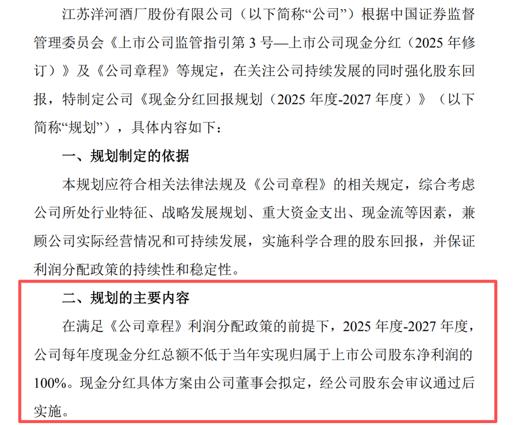 1月23日,洋河股份(002304.SZ)发布公告,对一年多前作出的分红承诺进行重大调整。 公司宣布,取消2024年8月公布的"2024年度-2026年度,公司每年度的现金分红总额不低于当年实现归母净利润的70%且不低于人民币70亿元(含税)"条 款,调整为"2025年度-2027年度,公司每年度现金分红总额不低于当年实现归属于上市公司股东净利润的100%"。 2024年8月,洋河股份曾发布一份被市场视为"慷慨"的股东回报规划。该规划承诺,在2024年至2026年期间,每年的现金分红将满足两个条件中的较高 者:一是不低于当年净利润的70%;二是不低于人民币70亿元。这一带有绝对金额"保底"的承诺,在A股市场颇具吸引力,为投资者提供了明确的现金流 预期。 然而,公司经营形势在承诺作出后发生变化。2024年全年,洋河股份实现净利润66.73亿元,同比下滑33.37%。为兑现第一年的70亿元分红承诺,公司被 指动用了往年积累。进入2025年,压力进一步增大。2025年前三季度,公司营收同比下降34.26%,净利润下降53.66%,第三季度单季出现亏损。全年净 利润预计降至20亿元区间,使得原有的保底承诺难以维持。 ...