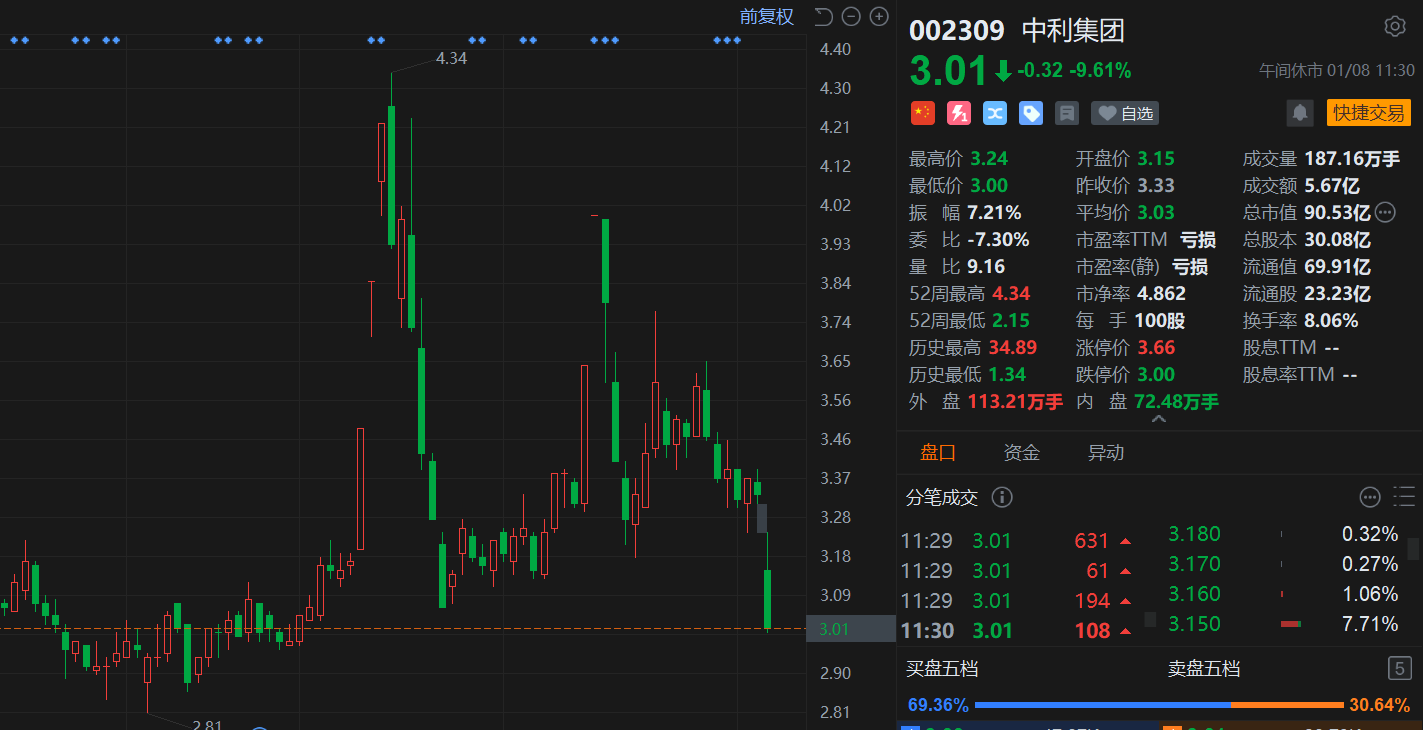 | | | | | SN | DOG | | | --- | --- | --- | --- | --- | --- | --- | | ◆ ◆ | | ◆ ◆ | ◆ ◆ ◆ ◆ | | 4.40 | 002309 中利集 | | | | 4.34 | | | 4.30 | 3.01 4 -0.32 -9. | | | | | | | | 전 조 조 ㆍ 1 | | | | | | | 4.21 | | | | | | | | 4.12 | 最高价 3.24 | | | | | | | | 最低价 3.00 | | | | | | | 4.02 | 振 幅 7.21% | | | | | | | 3.93 | 委 比 -7.30% | | | | | | | | 量 比 9.16 | | | | | | | 3.84 | 52周最高 4.34 E | | | | | | | 3.74 | 52周最低 2.15 | | | | | | | 3.65 | 历史最高 34.89 | | | | | | | | 历史最低 1.34 | | | | | | | 3.56 | 外 盘 113.21万手 | | | | ...