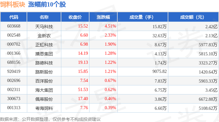饲料板块市场表现 - 2月3日,饲料板块整体上涨0.34%,表现弱于当日大盘,上证指数上涨1.29%,深证成指上涨2.19% [1] - 板块内个股表现分化,天马科技以4.51%的涨幅领涨,金新农、正虹科技、播恩集团等个股涨幅均超过1% [1] - 同时,部分个股出现下跌,邦基科技下跌3.65%,乖宝宠物下跌2.75%,是板块内跌幅最大的两只股票 [2] 个股交易数据 - 天马科技领涨板块,收盘价15.52元,成交额达2.42亿元 [1] - 海大集团成交额最高,为3.45亿元,收盘微涨0.62% [1] - 大北农成交量最大,达215.47万手,成交额8.83亿元,但股价微跌0.24% [2] - 乖宝宠物虽然股价下跌2.75%,但成交额仍高达3.31亿元 [2] 板块资金流向 - 当日饲料板块整体呈现主力资金净流出状态,净流出额为9992.05万元 [2] - 游资与散户资金则呈现净流入,金额分别为4675.29万元和5316.76万元 [2] - 海大集团获得主力资金最大净流入,为2468.34万元,主力净占比7.16% [3] - 金新农也获得1453.25万元的主力资金净流入,主力净占比6.82% [3] - 佩蒂股份、禾丰股份、傲农生物等个股则遭遇主力资金净流出,其中佩蒂股份主力净流出436.52万元 [3]