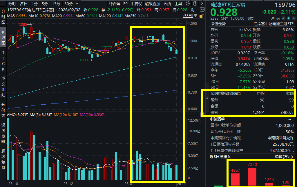 碳酸锂期货又陷“跌停风云”!电池ETF汇添富(159796)跌超2%,连续5日逆势吸金超1.8亿元!全固态电池催化密集落地,产业化进程提速!
