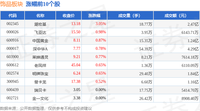 证券之星消息,12月1日饰品板块较上一交易日上涨0.27%,潮宏基领涨。当日上证指数报收于3914.01, 上涨0.65%。深证成指报收于13146.72,上涨1.25%。饰品板块个股涨跌见下表: | 代码 | 名称 | 收盘价 | 涨跌幅 | 成交量(手) | 成交额(元) | | --- | --- | --- | --- | --- | --- | | 002345 | 潮宏基 | 13.18 | 3.05% | 18.77万 | 2.47亿 | | 000026 | 飞亚达 | 15.50 | 0.98% | 3.95万 | 6143.71万 | | 600916 | 中国黄金 | 8.11 | 0.87% | 15.35万 | 1.24亿 | | 000017 | 深中华A | 7.77 | 0.78% | 54.39万 | 4.29亿 | | 603900 | 苹细通灵 | 9.21 | 0.77% | 8.21万 | 7614.18万 | | 600612 | 老凤祥 | 45.04 | 0.65% | 1.36万 | 6110.09万 | | 002574 | 明牌珠宝 | 6.24 | 0. ...
