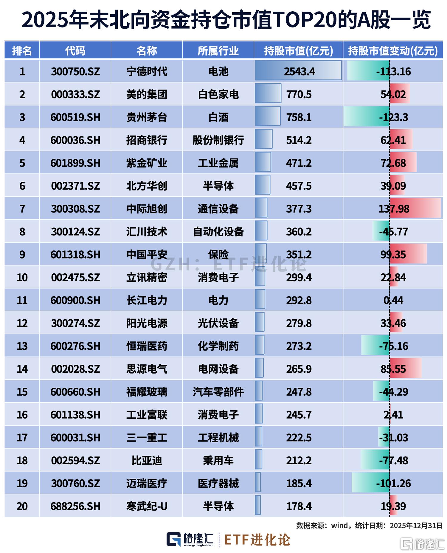 北向资金2025年四季度整体动向 - 2025年第四季度北向资金净流入101.5亿元,持有A股市值从三季度末的25,852亿元小幅提升至25,898亿元 [1] 前十大重仓股及前二十大变动 - 截至2025年末,北向资金前十大重仓股依次为:宁德时代、美的集团、贵州茅台、招商银行、紫金矿业、北方华创、中际旭创、汇川技术、中国平安、立讯精密 [1] - 前二十大重仓股中,思源电气和寒武纪-U为新进,药明康德和澜起科技退出 [1] - 宁德时代为第一大重仓股,持股市值达2,543.4亿元 [2] 四季度主要增持方向及个股 - 主要增持新能源领域,包括宁德时代(净流入121.9亿元)、德业股份(净流入32.3亿元)、阳光电源(净流入19.2亿元) [3][4] - 主要增持电子领域,包括立讯精密(净流入61.0亿元)、北方华创(净流入32.6亿元)、兆易创新(净流入23.6亿元) [3][4] - 主要增持有色金属领域,包括中国铝业(净流入32.6亿元)、江西铜业(净流入22.6亿元)、中金黄金(净流入20.2亿元)、华友钴业(净流入19.1亿元) [3][4] - 主要增持大金融领域,包括招商银行(净流入42.6亿元)、中国平安(净流入34.9亿元) [3][4] - 其他获显著增持的个股包括潍柴动力(净流入48.7亿元)、天孚通信(净流入23.9亿元) [3][4] 四季度主要减持方向及个股 - 主要减持白酒领域,包括贵州茅台(净流出84.5亿元)、五粮液(净流出25.5亿元) [4][5] - 主要减持医药领域,包括药明康德(净流出53.2亿元)、迈瑞医疗(净流出42.2亿元)、恒瑞医药(净流出18.5亿元) [4][5] - 主要减持汽车领域,包括比亚迪(净流出49.8亿元)、赛力斯(净流出37.7亿元)、上汽集团(净流出25.7亿元) [4][5] - 主要减持非银金融领域,包括东方财富(净流出40.0亿元)、华泰证券(净流出34.2亿元)、中信证券(净流出20.3亿元) [4][5] 行业持仓市值排名 - 截至2025年末,北向资金持仓市值前五大行业依次为:电力设备(4,495.2亿元)、电子(3,870.4亿元)、有色金属(1,855.8亿元)、银行(1,772.6亿元)、机械设备(1,541.9亿元) [6] - 医药生物、食品饮料、汽车行业持仓市值分别为1,429.7亿元、1,387.9亿元、1,323.7亿元 [6] 四季度行业持仓市值变动 - 持仓市值增长最多的三个行业为:有色金属(增加516.3亿元)、通信(增加194.8亿元)、基础化工(增加88.6亿元) [7][8] - 持仓市值减少最多的三个行业为:医药生物(减少403.2亿元)、食品饮料(减少235.2亿元)、汽车(减少137.7亿元) [8][9] 外资机构对中国资产的观点 - 花旗集团经济学家认为,2025年海外投资者的观念已从“中国不可投资论”转变为“中国资产不可回避” [11] - 摩根士丹利策略师认为,进入2026年将有更多外资回归中国市场,主动型基金增加配置只是时间问题 [11] - 摩根大通将A股评级上调至“超配”,预测沪深300指数目标位为5,200点 [11] - 高盛预计2026年中国实际GDP增长4.8%,并预测MSCI中国指数和沪深300指数年内将分别上涨20%和12%,预计2026年和2027年中国企业盈利将分别环比增长14%和12% [11] - 瑞银预测全部A股公司盈利增速将从2025年的6%提升至2026年的8% [11]