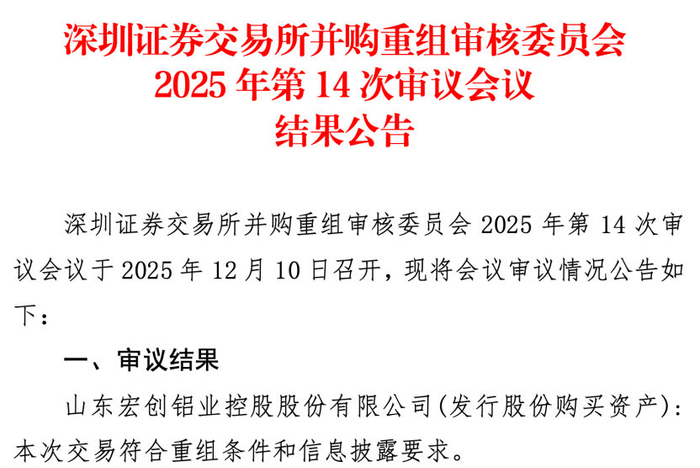 【#宏创控股635亿元并购重组过会#】12月10日,深交所并购重组审核委员会2025年第14次审议会议召 开,审议结果为:宏创控股发行股份购买资产交易符合重组条件和信息披露要求。 根据宏创控股此前 公布的方案,宏创控股拟发行股份购买魏桥铝电、嘉汇投资、东方资管等持有的宏拓实业100%股权, 交易作价635亿元。 宏创控股目前主要从事铝深加工业务,主要产品为铝板带、家用箔、容器箔、药用箔、装饰箔等。标的 公司宏拓实业业务则涵盖了电解铝、氧化铝、铝深加工的铝产品全产业链。宏拓实业拥有电解铝年产能 645.90万吨,氧化铝年产能1900万吨。是全球领先的铝产品制造商,目前也是全球最大的电解铝生产商 之一。 今年前5月,宏拓实业营收为648.3亿元。根据预测,标的公司宏拓实业2025年营业收入可达1419.3亿 元,2029年达到1469.6亿元。(e公司) ...