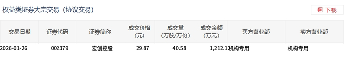 大宗交易概况 - 宏创控股于2026年1月15日发生一笔大宗交易,成交15万股,成交金额为441万元 [1] - 该笔大宗交易成交价格为29.40元,与当日市场收盘价29.40元持平 [1] - 该笔交易占当日总成交额的0.67% [1] 交易细节 - 交易证券为宏创控股,证券代码为002379 [2] - 交易类型为权益类证券大宗交易(协议交易) [2] - 买方营业部与卖方营业部均显示为“机构专用” [2]