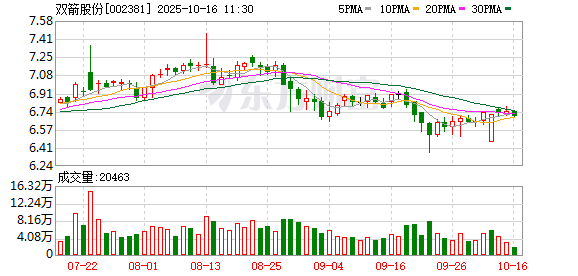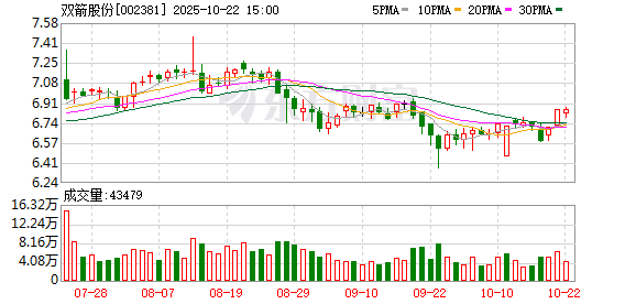 | 证券代码:002381 | 证券简称:双箭股份 | 公告编号:2025-031 | | --- | --- | --- | | 债券代码:127054 | 债券简称:双箭转债 | | 浙江双箭橡胶股份有限公司 关于 2025 年第三季度可转债转股情况的公告 本公司及董事会全体成员保证信息披露的内容真实、准确、完整,没有虚假 记载、误导性陈述或重大遗漏。 特别提示: 根据《深圳证券交易所股票上市规则》《深圳证券交易所上市公司自律监管 指引第15号——可转换公司债券》等有关规定,浙江双箭橡胶股份有限公司(以 下简称"公司"或"双箭股份")现将2025年第三季度可转换公司债券(以下简 称"可转债"或"双箭转债")转股及公司股份变动情况公告如下: 一、可转债发行及上市情况 (一)可转债发行情况 经中国证券监督管理委员会《关于核准浙江双箭橡胶股份有限公司公开发行 可转换公司债券的批复》(证监许可〔2021〕3594号)核准,公司于2022年2月 11日向社会公开发行513.64万张可转债,每张面值人民币100元,按面值发行, 募集资金总额为人民币51,364.00万元,期限6年。 (二)可转债上市情况 经深圳证券交 ...