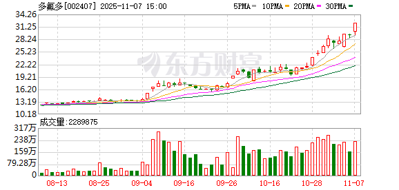 中国经济网北京11月7日讯 多氟多(002407)今日涨停,收报32.10元,涨幅10.01%。 龙虎榜数据显示,买入多氟多金额最大的前五名中,有2家机构专用席位;卖出多氟多金额最大的前五名中,有2家机构专用席位。经统计,机构席位今 日买入多氟多净额为43833.64万元。 | 序号 | 上榜日期 | 相关 | 1 11 11 0 0 0 0 0 0 2 | | | 机构卖出 0 | 机构买入 | | --- | --- | --- | --- | --- | --- | --- | --- | | | | | 机构数 | 机幅2度数 | 总额(万) | 总额(万) | 净额(万) | | 1 | 2025-11-07 明细 股吧 32.10 10.01% | | | 2 | 59631.97 | 15798.33 | 43833.64 | | 序号 | 交易营业部名称 | | 买入金额(万) | 占总成交比例 | 卖出金额(万) | | --- | --- | --- | --- | --- | --- | | | 深股通专用 | 783次 46.62% | 47870.99 | 6.69% | 39395 ...