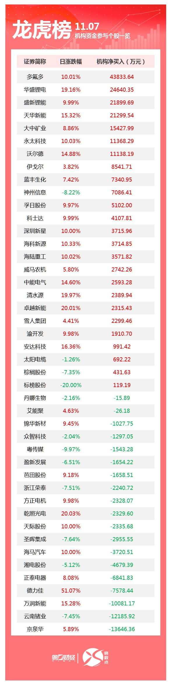 (文章来源:第一财经) 当天机构净卖出前三的股票分别是京泉华、云南锗业、万润新能,净流出金额分别是1.36亿元、1.22亿 元、1.01亿元。 | | 龙虎榜 11.07 | | | --- | --- | --- | | 证券简称 | 日涨跌幅 | 机构净买入(万元) | | 多氟多 | 10.01% | 43833.64 | | 长盛锂电 | 19.16% | 24640.35 | | 盛新锂能 | 9.99% | 21899.69 | | 天华新能 | 15.32% | 21299.54 | | 大中矿业 | 8.86% | 15427.99 | | 永太科技 | 10.03% | 11368.29 | | 沃尔德 | 14.88% | 11138.19 | | 伊戈尔 | 3.82% | 8541.71 | | 蓝丰生化 | 7.42% | 7340.95 | | 神州信息 | -8.22% | 7086.41 | | 手目股份 | 9.97% | 5102.00 | | 科士达 | 9.99% | 4107.81 | | --- | --- | --- | | 深圳新星 | 10.00% | 371 ...