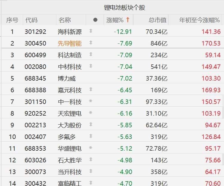 A股锂电池概念股走弱,海科新源跌近13%,先导智能跌超7%,嘉元科技、中一科技、天宏锂电跌超6%,大为股份、多氟多、华盛锂电跌超5%