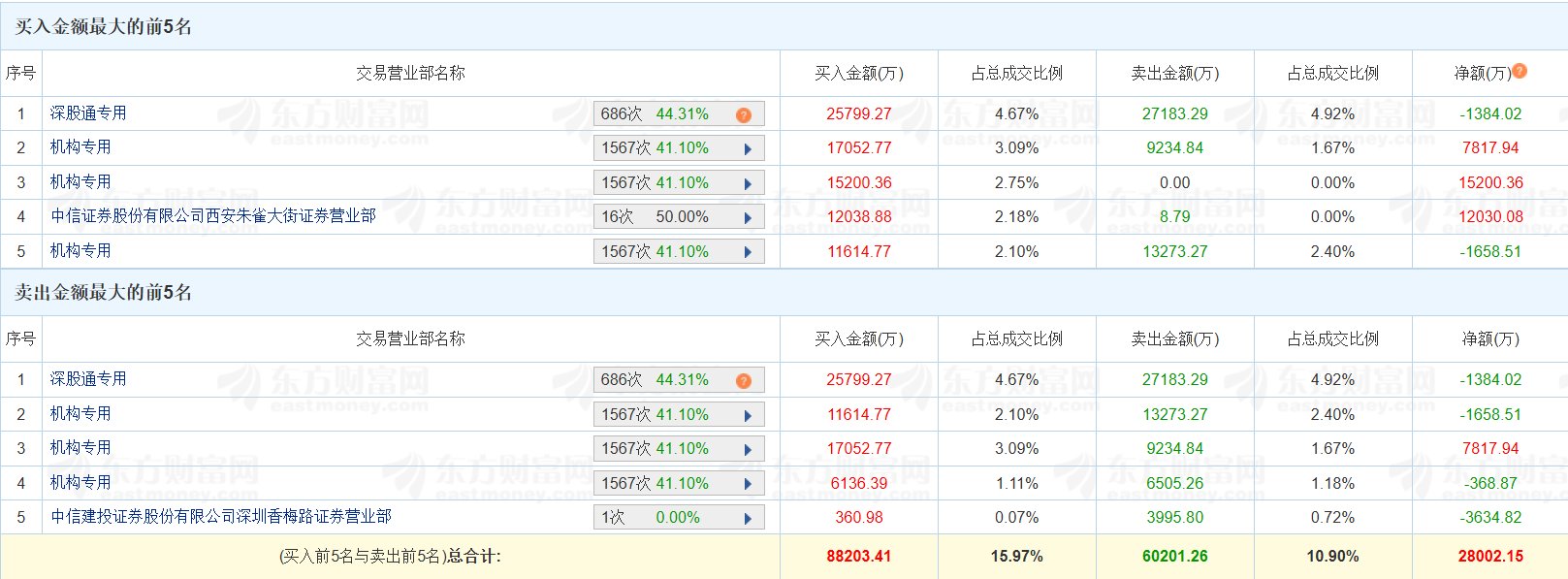 格隆汇12月23日|多氟多(002407.SZ)今日涨停,换手率16.22%,成交额55.24亿元。龙虎榜数据显示,深股通净卖出1384万元;四家机构买入5亿元,卖出 2.9亿元,净买入2.1亿元;游资"方新侠"位列买四席位,净买入1.2亿元。上榜席位全天买入8.82亿元,卖出6.02亿元,合计净买入2.8亿元。(格隆汇) | | 买入金额最大的前5名 | | | | | --- | --- | --- | --- | --- | | 序号 | | 交易营业部名称 | 买入金额(万) | 占总成交比例 | | | 深股通专用 | 686次 44.31% 2 | 25799.27 | 4.67% | | 2 | 机构专用 | 1567次 41.10% | 17052.77 | 3.09% | | 3 | 机构专用 | 1567次 41.10% | 15200.36 | 2.75% | | 4 | 中信证券股份有限公司西安朱雀大街证券营业部 | 16次 50.00% | 12038.88 | 2.18% | | 5 | 机构专用 | 1567次 41.10% | 11614.77 | 2.10% | | 序号 | ...