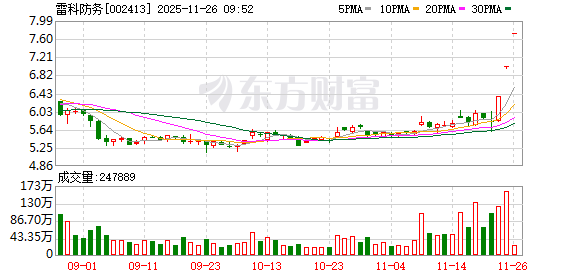 雷科防务盘中涨停,已连收3个涨停板,截至9:25,该股报7.71元,换手率0.92%,成交量1189.87万股, 成交金额9173.92万元,涨停板封单金额为9.90亿元。连续涨停期间,该股累计上涨33.16%,累计换手 率为22.82%。最新A股总市值达101.54亿元,A股流通市值99.70亿元。 证券时报·数据宝统计,两融数据来看,该股最新(11月25日)两融余额为4.85亿元,其中,融资余额 4.84亿元,较前一个交易日增加1877.92万元,环比增长4.04%,近3日累计增加3117.38万元,环比增长 6.89%。 公司发布的三季报数据显示,前三季公司共实现营业收入9.33亿元,同比增长34.00%,实现净利 润-9061.33万元,同比增长32.61%,基本每股收益为-0.0700元。 据天眼查APP显示,北京雷科防务科技股份有限公司成立于2002年12月11日,注册资本131698.9628万 人民币。(数据宝) 近日该股表现 | 日期 | 当日涨跌幅(%) | 换手率(%) | 主力资金净流入(万元) | | --- | --- | --- | --- | | 2025.11.25 | 10 ...