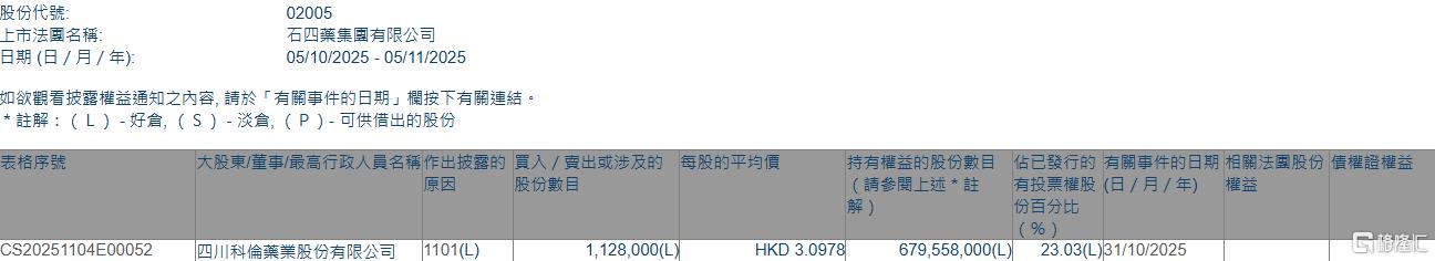 股权变动 - 四川科伦药业股份有限公司于2025年10月31日增持石四药集团112.8万股股份 [1] - 增持每股平均价为3.0978港元,总涉资约349.43万港元 [1] - 增持后,四川科伦药业持股数量增至679,558,000股,持股比例由22.99%上升至23.03% [1][2]