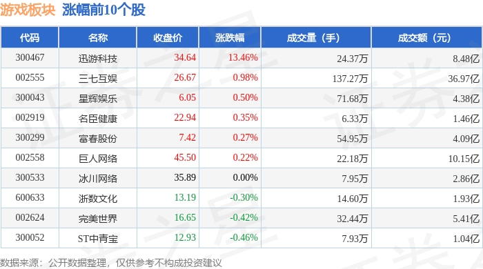 市场整体表现 - 2024年1月6日,游戏板块整体上涨1.05%,表现强于大盘,当日上证指数上涨1.5%,深证成指上涨1.4% [1] - 板块内个股表现分化,凯撒文化以9.89%的涨幅领涨,恺英网络上涨4.46%,吉比特上涨2.77%,昆仑万维上涨2.56%;同时,汤姆猫下跌3.75%,完美世界下跌1.12% [1][2] - 从资金流向看,游戏板块整体呈现主力资金净流出14.05亿元,但游资和散户资金分别净流入8495.83万元和13.2亿元,表明市场内部资金存在分歧 [2] 领涨个股分析 - 凯撒文化收盘价4.00元,大涨9.89%,成交量40.16万手,成交额1.58亿元,主力资金净流入6076.81万元,主力净占比高达38.43% [1][3] - 恺英网络收盘价24.36元,上涨4.46%,成交量91.23万手,成交额21.79亿元,获得主力资金净流入2.55亿元,主力净占比为11.70% [1][3] - 巨人网络收盘价45.40元,上涨1.84%,成交量29.21万手,成交额13.17亿元,主力资金净流入5982.02万元,主力净占比4.54% [1][3] 资金流向详情 - 恺英网络主力资金净流入2.55亿元,但同时游资净流出3572.02万元,散户净流出2.19亿元 [3] - 迅游科技主力资金净流入1576.46万元,主力净占比5.20%,但游资净流出1973.72万元 [3] - 完美世界主力资金净流出238.64万元,游资净流出4545.43万元,但散户资金净流入4784.08万元 [3] - 电魂网络主力资金净流出117.10万元,游资净流出740.05万元,但散户资金净流入857.15万元 [3] 成交活跃度 - 三七互娱成交额最高,达61.30亿元,成交量228.62万手,股价上涨1.73% [1] - 昆仑万维成交额42.36亿元,成交量94.97万手,股价上涨2.56% [1] - 汤姆猫尽管股价下跌3.75%,但成交量高达541.54万手,成交额27.92亿元 [2] - 吉比特股价448.99元,上涨2.77%,成交额10.87亿元,但成交量相对较低,为2.44万手 [1]
