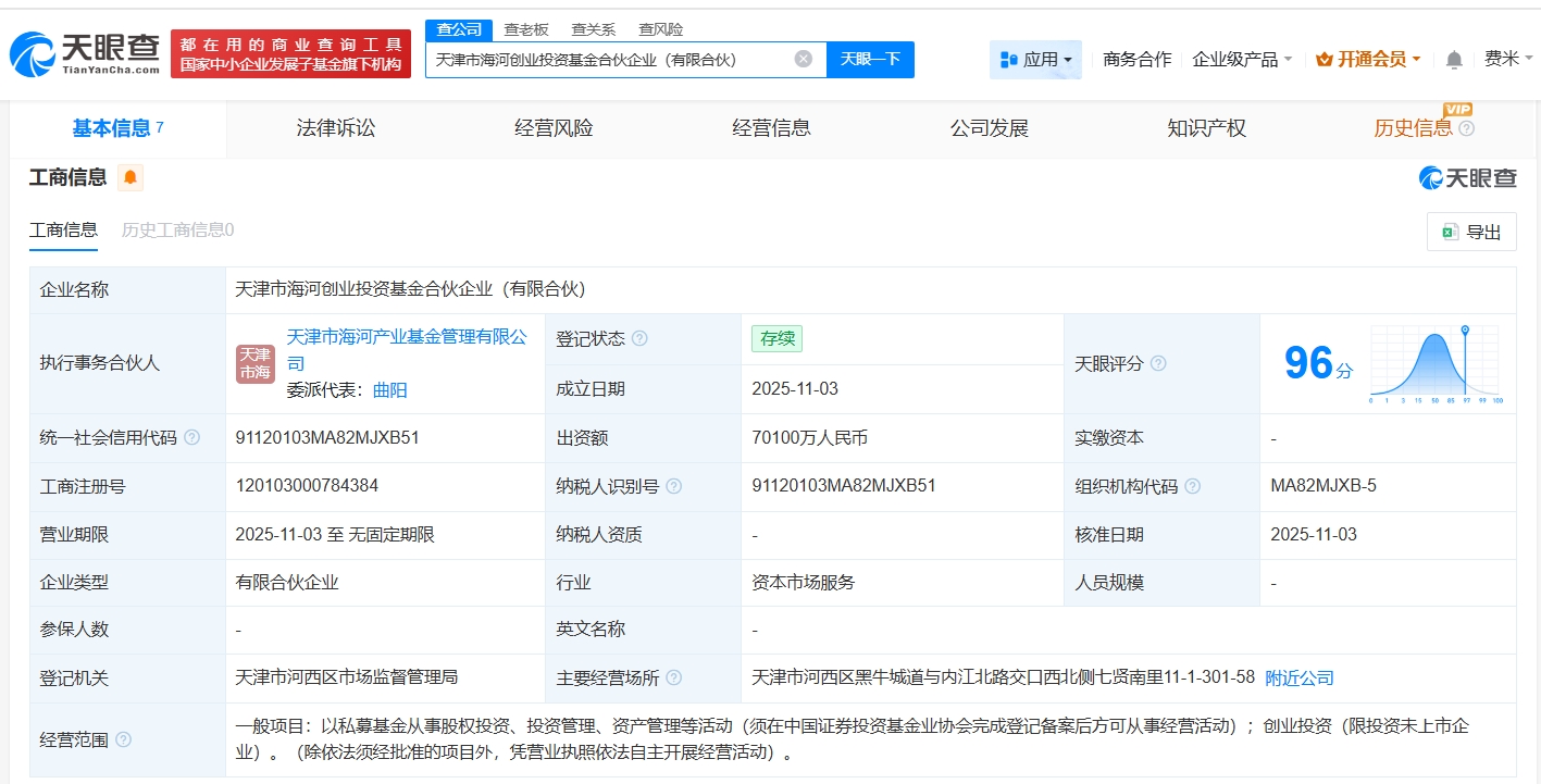 天津市海河创业投资基金登记成立,出资额7.01亿元