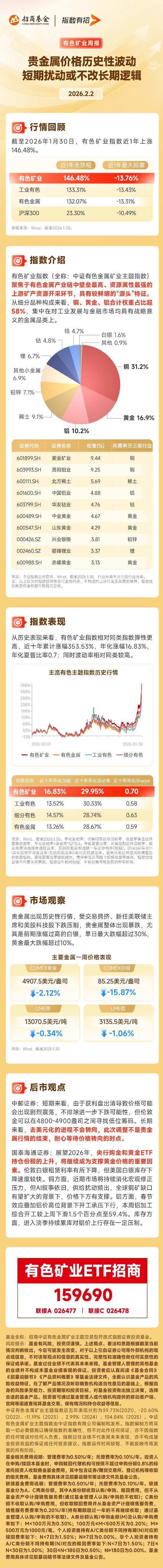市场表现与行情回顾 - 2月3日,有色板块持续回暖,湖南黄金冲击涨停,盛和资源、云南锗业、北方稀土、中国稀土等涨超4%,有色矿业ETF招商(159690)涨超2% [1] - 上周贵金属出现历史性暴跌,白银单日最大跌幅超过30%,黄金最大跌幅超过10%,受交易拥挤、新任美联储主席和美股科技股下跌压制 [1][12] - 截至2月3日发稿,金银现货价格反弹,伦敦银现涨超5%,伦敦金现涨超3% [1] - 截至2025年1月30日当周,COMEX黄金价格报4907.5美元/盎司,周涨跌幅为-15.87%;COMEX白银价格报85.25美元/盎司,周涨跌幅为-2.12% [13] - 截至2025年1月30日当周,LME铝价格报3135.5美元/吨,周涨跌幅为-1.06% [13] 机构观点与后市展望 - 中邮证券短期观点认为,由于获利盘出清,价格可能出现剧烈震荡,不排除进一步下跌可能性,但伦敦金可以在4800-4900盎司之间寻找低位筹码 [1][14] - 中邮证券长期观点认为,去美元化进程不会转向,此次调整不是贵金属行情的结束,需耐心等待价格转向时点 [1][14] - 国泰海通证券展望2026年,认为央行购金和黄金ETF持仓份额上升将继续成为支撑黄金价格的重要因素 [15] - 国泰海通证券指出,伦敦白银租赁利率有所下降,但美国白银库存下降速度较快 [15] - 对于铜,国泰海通证券认为近期市场将持续消化宏观修正压力,但AI叙事依旧且供给扰动频出,在全球铜矿缺口有望扩大的背景下,价格下方有支撑 [15] - 对于铝,国泰海通证券指出春节效应叠加铝价高位背景下开工承压,铝加工综合开工率较上周下滑1.5个百分点至59.4%,且进入淡季持续累库对铝价上行存在一定压制 [15] 有色矿业指数介绍 - 有色矿业指数全称为中证有色金属矿业主题指数,高度聚焦于有色金属产业链最上游、壁垒最高、资源属性最强的矿产资源开采环节,具有鲜明的“源头”特征 [1][4] - 从细分品种构成看,铜、黄金、铝合计权重占比超过58%,集中在对工业发展与金融市场均具有战略意义的金属品类上 [4] - 指数前十大权重股包括紫金矿业(权重9.44%,铜)、洛阳钼业(权重9.25%,铜)、北方稀土(权重5.69%,稀土)、中国铝业(权重4.88%,铝)、华友钴业(权重4.76%,钴)、中金黄金(权重4.67%,黄金)、山东黄金(权重4.29%,黄金)、兴业银锡(权重3.81%,铅锌)、赣锋锂业(权重3.37%,锂)、赤峰黄金(权重3.13%,黄金) [5][7] - 根据指数细分品种权重图,铜权重最高,为31.2%,其次为黄金(16.9%)、铝(10.2%)、稀土(9.1%)、铅锌(7.1%)、锂(6.7%)、其他小金属(6.9%)、钴(4.8%)、钨(4.7%)、白银(1.6%)及其他(0.9%) [6] - 当有色金属价格上涨时,上游矿产公司的利润会直接、快速地提升,因此该指数表现出更强的价格弹性,贝塔值更高,在商品牛市或通胀环境中进攻性十足 [1] 有色矿业指数历史表现 - 近十年,有色矿业指数累计涨幅为353.53%,年化涨幅为16.83%,年化夏普比率为0.70,同时波动率相对同类较高 [9][11] - 近十年,有色矿业指数年化波动率为29.95% [11] - 与其他主流有色主题指数相比,有色矿业指数近十年年化涨幅(16.83%)高于工业有色指数(13.52%)、细分有色指数(14.57%)和有色金属指数(13.26%) [11] - 近五年,中证有色金属矿业主题指数年度表现分别为:2021年39.73%、2022年-20.60%、2023年-11.19%、2024年2.99%、2025年104.84% [18]