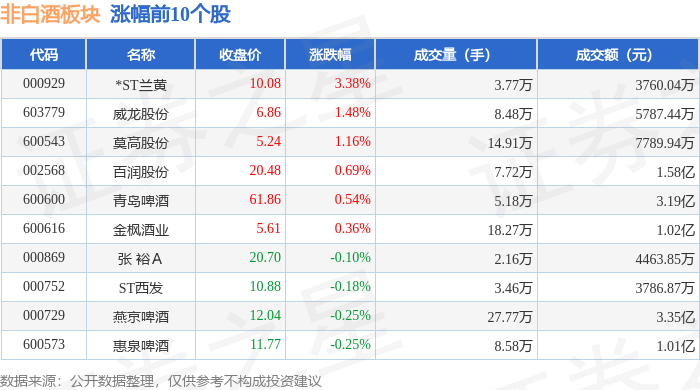 非白酒板块市场表现 - 2024年1月29日,非白酒板块整体表现强劲,较上一交易日上涨5.18% [1] - 当日上证指数上涨0.16%,收于4157.98点,而深证成指下跌0.3%,收于14300.08点 [1] - 板块内个股普涨,领涨股会稽山和古越龙山均以10.00%的涨幅涨停收盘 [1] 领涨个股详情 - 会稽山收盘价为22.98元,涨幅10.00%,成交量为31.69万手,成交额为2.67亿元 [1] - 古越龙山收盘价为10.89元,涨幅10.00%,成交量为83.06万手,成交额为8.63亿元 [1] - 中信尼雅收盘价为6.62元,涨幅9.97%,成交量为13.39万手,成交额为8853.71万元 [1] - 金枫酒业收盘价为5.95元,涨幅6.82%,成交量为51.73万手,成交额为3.01亿元 [1] - 百润股份收盘价为21.66元,涨幅6.80%,成交量为21.92万手,成交额为4.62亿元 [1] 其他上涨个股表现 - 顾思明如收盘价为63.57元,涨幅5.49%,成交量为15.55万手,成交额为9.65亿元 [1] - 威龙股份收盘价为6.93元,涨幅4.21%,成交量为16.38万手,成交额为1.12亿元 [1] - 张裕A收盘价为21.90元,涨幅3.94%,成交量为6.69万手,成交额为1.44亿元 [1] - 珠江啤酒收盘价为9.85元,涨幅3.90%,成交量为19.13万手,成交额为1.85亿元 [1] - *ST椰岛收盘价为6.43元,涨幅3.88%,成交量为10.93万手,成交额为6922.71万元 [1] 板块内其他个股涨跌 - 重庆啤酒收盘价为54.62元,涨幅3.45%,成交量为7.61万手,成交额为4.10亿元 [2] - 飘堂船舶收盘价为12.21元,涨幅3.56%,成交量为13.29万手,成交额为1.60亿元 [2] - 就有限酒(燕京啤酒)收盘价为12.58元,涨幅3.62%,成交量为40.21万手,成交额为4.96亿元 [2] - 莫高股份收盘价为5.88元,涨幅2.98%,成交量为18.61万手,成交额为1.08亿元 [2] - ST西发收盘价为11.03元,涨幅1.47%,成交量为4.95万手,成交额为5421.36万元 [2] - *ST兰黄是板块内唯一录得下跌的个股,收盘价为9.90元,跌幅1.00%,成交量为4.89万手,成交额为4852.01万元 [2] 板块资金流向 - 当日非白酒板块整体获得主力资金净流入3.51亿元 [2] - 游资资金净流出9778.93万元,散户资金净流出2.53亿元 [2] 个股资金流入排名 - 会稽山获得主力资金净流入最多,达9130.27万元,主力净流入占比为13.06% [3] - 顾思明如主力资金净流入6267.89万元,主力净流入占比为6.49% [3] - 百润股份主力资金净流入5192.82万元,主力净流入占比为11.24% [3] - 古越龙山主力资金净流入4770.80万元,主力净流入占比为5.53% [3] - 燕京啤酒主力资金净流入3815.78万元,主力净流入占比为7.70% [3] 个股资金流出情况 - 在主力资金净流入的个股中,会稽山、顾思明如、百润股份、古越龙山、重庆啤酒、珠江啤酒、*ST椰岛同时遭遇游资净流出 [3] - 例如,会稽山游资净流出4508.05万元,游资净流出占比6.45% [3] - 所有列出的个股均呈现散户资金净流出的状态 [3]