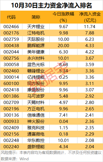 电子、通信行业主力资金净流出金额均超百亿元。 A股三大指数今日(10月30日)集体回调,沪指失守4000点大关,行业板块多数收跌,能源金属板块大 涨,钢铁行业、电池板块涨幅居前;游戏、电源设备、电子化学品、煤炭行业、证券、农药兽药、电子 元件板块跌幅居前。 从今日主力资金情况来看,沪深两市全天主力资金净流出765.66亿元。仅交通运输、纺织服饰2个行业 主力资金净流入,金额分别为9497.05万元、9287.6万元。 29个主力资金净流出行业中,电子、通信行业主力资金净流出金额居前,金额分别为154.64亿元、 110.08亿元;计算机、电力设备、机械设备、非银金融行业主力资金净流出金额均超50亿元;汽车、医 药生物、国防军工行业主力资金净流出金额均超30亿元。 11股获主力资金净流入均超3亿元 据证券时报·数据宝统计,从个股来看,58股主力资金净流入均超1亿元,其中11股获主力资金净流入均 超3亿元。 有色金属龙头天齐锂业主力资金净流入11.74亿元,居首。受美联储降息等利好提振,有色板块再度冲 高,天齐锂业盘中涨停。昨日晚间,公司发布三季报,尽管前三季度营收同比下降26.5%至74亿元,归 母净利润却实现 ...