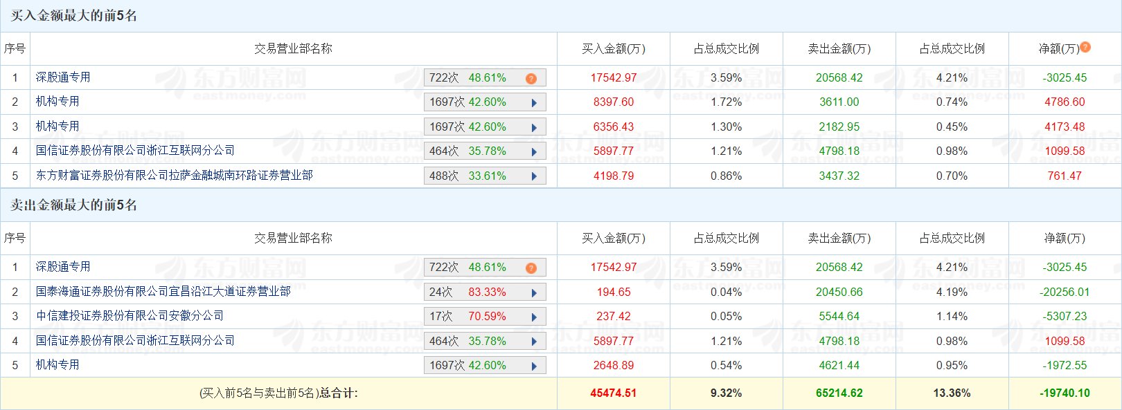 | 序号 | 交易营业部名称 | | 买入金额(万) | 占总成交比例 | | --- | --- | --- | --- | --- | | | 深股通专用 | 722次 48.61% 2 | 17542.97 | 3.59% | | 2 | 机构专用 | 1697次 42.60% | 8397.60 | 1.72% | | 3 | 机构专用 | 1697次 42.60% | 6356.43 | 1.30% | | 4 | 国信证券股份有限公司浙江互联网分公司 | 464次 35.78% | 5897.77 | 1.21% | | 5 | 东方财富证券股份有限公司拉萨金融城南环路证券营业部 | 488次 33.61% | 4198.79 | 0.86% | 格隆汇1月7日|昨日涨停的中超控股(002471.SZ)今日盘中一度涨近9%,最终收涨1.84%,换手率43.5%,成交额48.8亿元。龙虎榜数据显示,深股通净买入 3025万元;三家机构买入1.74亿元,卖出1.04亿元,净买入6988万元;游资"消闲派"位列卖二席位,净卖出2.03亿元。上榜席位全天买入4.55亿元,卖出6.52 亿元,合计净卖出1. ...