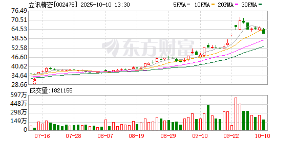 10月10日,立讯精密跌5.15%,截至发稿,报61.94元/股,成交76.31亿元,换手率1.67%,总市值 4510.35亿元。 资料显示,立讯精密工业股份有限公司位于广东省东莞市清溪镇北环路313号,中国香港铜锣湾希慎道33 号利园1期19楼1901室,成立日期2004年5月24日,上市日期2010年9月15日,公司主营业务涉及公司专 注于连接器的研发、生产和销售,产品主要应用于3C(电脑、通讯、消费电子)、汽车和通讯设备等领 域。主营业务收入构成为:消费性电子78.55%,通讯互联产品及精密组件8.91%,汽车互联产品及精密 组件6.95%,电脑互联产品及精密组件3.93%,其他连接器及其他业务1.65%。 国金中证A500指数增强A(022485)成立日期2024年11月18日,最新规模2.06亿。今年以来收益 31.78%,同类排名1940/4220;成立以来收益31.66%。 国金中证A500指数增强A(022485)基金经理为姚加红。 截至发稿,姚加红累计任职时间2年280天,现任基金资产总规模68.71亿元,任职期间最佳基金回报 55.9%, 任职期间最差基金回报28.79%。 风险提示:市 ...
