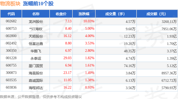 物流板块市场表现 - 2024年11月17日物流板块整体下跌0.92%,表现弱于上证指数(下跌0.46%)和深证成指(下跌0.11%)[1] - 板块内个股表现分化,龙洲股份以10.03%的涨幅领涨,*ST原尚以5.00%的跌幅领跌[1][2] 领涨个股表现 - 龙洲股份涨幅最大,达10.03%,收盘价7.13元,成交额3260.11万元[1] - *ST海钦上涨5.00%,收盘价8.40元,成交额7951.06万元[1] - 天顺股份上涨4.00%,收盘价16.12元,成交额1.93亿元[1] - 恒基达鑫、华鹏飞、永泰运等个股涨幅均超过1.5%[1] 领跌个股表现 - *ST原尚跌幅最大,为5.00%,收盘价35.88元,成交额806.58万元[2] - 申通快递下跌2.76%,收盘价15.17元,成交额2.67亿元[2] - 广汇物流、圆通速递、ST雪发等个股跌幅均超过2%[2] 板块资金流向 - 当日物流板块主力资金净流出3.19亿元[2] - 游资资金净流入9725.79万元,散户资金净流入2.22亿元[2] - 龙洲股份主力净流入1236.30万元,主力净占比高达37.92%[3] - 炬申股份主力净流出2101.20万元,主力净占比为-6.50%[3]