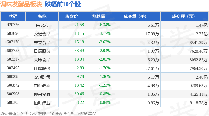 板块整体表现 - 11月20日调味发酵品板块整体下跌0.54%,表现弱于大盘,当日上证指数下跌0.4%,深证成指下跌0.76% [1] - 板块内个股普遍下跌,在列出的15只个股中,仅日辰股份一只上涨,涨幅为2.21%,其余14只个股均录得下跌 [1][2] 领跌个股情况 - 朱老六为当日板块领跌股,收盘价20.30元,跌幅达6.88%,成交量为6.37万手,成交额为1.31亿元 [2] - 安记食品跌幅次之,下跌3.93%,收盘价12.23元,成交量为10.40万手,成交额为1.29亿元 [2] - 宝立食品下跌2.29%,仲景食品下跌2.21%,安琪酵母下跌2.02% [2] 资金流向 - 当日调味发酵品板块主力资金净流出1.35亿元 [2] - 游资资金呈现净流入状态,净流入861.73万元 [2] - 散户资金净流入1.26亿元 [2]
