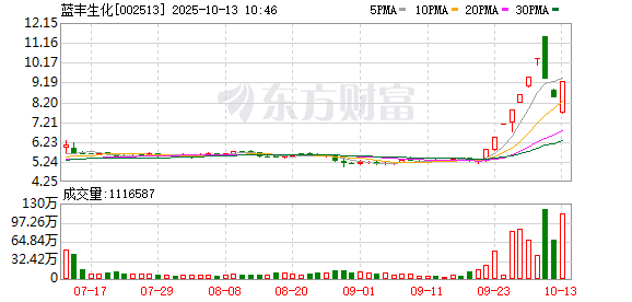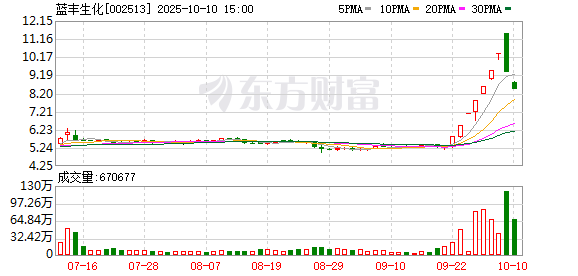 10月13日,蓝丰生化(002513)涨停,上演"地天板",截至午间收盘,成交额近10亿元,换手率超 40%。此前,公司七连涨停后连续两个交易日跌停。 | 蓝丰生化(002513) 2025年10月13日 星期一 PageUp/Down:前后日 空格链:操作 | | | | | | ×ロ | | --- | --- | --- | --- | --- | --- | --- | | 三生化 分时(静态) ◎ 相对今开20.57% | 9.98% | 11:27 | 9.26 | | | | | 9.26 | | 11:28 | 9.26 | 8 | | | | 9.14 | 8.55% | 11:28 | 9.26 | 14 | S | 2 | | 9.02 | 7.13% | 11:28 | 9.26 | 42 | ਟੇ | 3 | | 06'8 | 5.70% | 11:28 | 9.26 | 5 | S | | | 8.78 | 4.28% | 11:28 | 9.26 | 10 | S | | | 8.66 | 2.85% | 11:28 | 9.26 | 2 | S | | | 8.54 | 1.4 ...