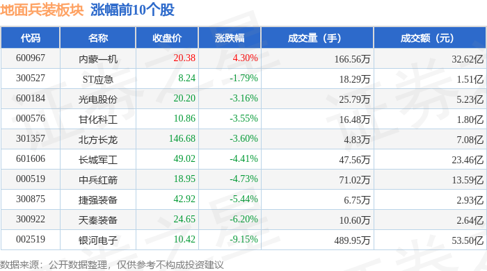 证券之星消息,1月13日地面兵装板块较上一交易日下跌4.46%,国科军工领跌。当日上证指数报收于 4138.76,下跌0.64%。深证成指报收于14169.4,下跌1.37%。地面兵装板块个股涨跌见下表: | 代码 | 名称 | 收盘价 | 涨跌幅 | 成交量(手) | 成交额(元) | | | --- | --- | --- | --- | --- | --- | --- | | 600967 | 内蒙一机 | 20.38 | 4.30% | 166.56万 | | 32.62亿 | | 300527 | ST应急 | 8.24 | -1.79% | 18.29万 | | = 1.51亿 | | 600184 | 光电股份 | 20.20 | -3.16% | 25.79万 | | 5.23亿 | | 000576 | 甘化科工 | 10.86 | -3.55% | 16.48万 | | 1.80亿 | | 301357 | 北方长龙 | 146.68 | -3.60% | 4.83万 | | 7.08亿 | | 601606 | 长城军工 | 49.02 | -4.41% | 47.56万 | | 23. ...