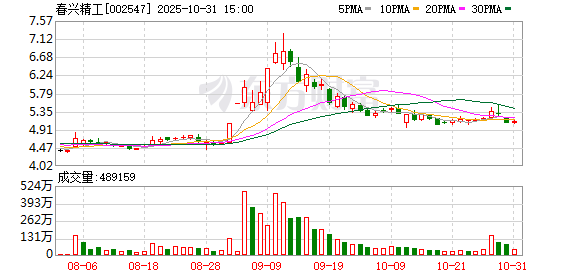 11月4日,春兴精工盘中下跌2.08%,截至13:15,报5.17元/股,成交1.69亿元,换手率2.92%,总市值 58.32亿元。 资金流向方面,主力资金净流出2194.43万元,特大单买入241.19万元,占比1.43%,卖出1465.27万元, 占比8.69%;大单买入2415.75万元,占比14.33%,卖出3386.09万元,占比20.08%。 春兴精工今年以来股价涨26.41%,近5个交易日跌3.54%,近20日跌2.64%,近60日涨17.23%。 截至10月20日,春兴精工股东户数14.89万,较上期减少6.21%;人均流通股7422股,较上期增加 6.62%。2025年1月-9月,春兴精工实现营业收入15.80亿元,同比减少1.13%;归母净利润-2.00亿元,同 比减少13.18%。 分红方面,春兴精工A股上市后累计派现1.22亿元。近三年,累计派现0.00元。 机构持仓方面,截止2025年9月30日,春兴精工十大流通股东中,香港中央结算有限公司位居第二大流 通股东,持股2026.58万股,相比上期增加1603.58万股。 责任编辑:小浪快报 今年以来春兴精工已经7次登上龙虎榜,最近一次 ...